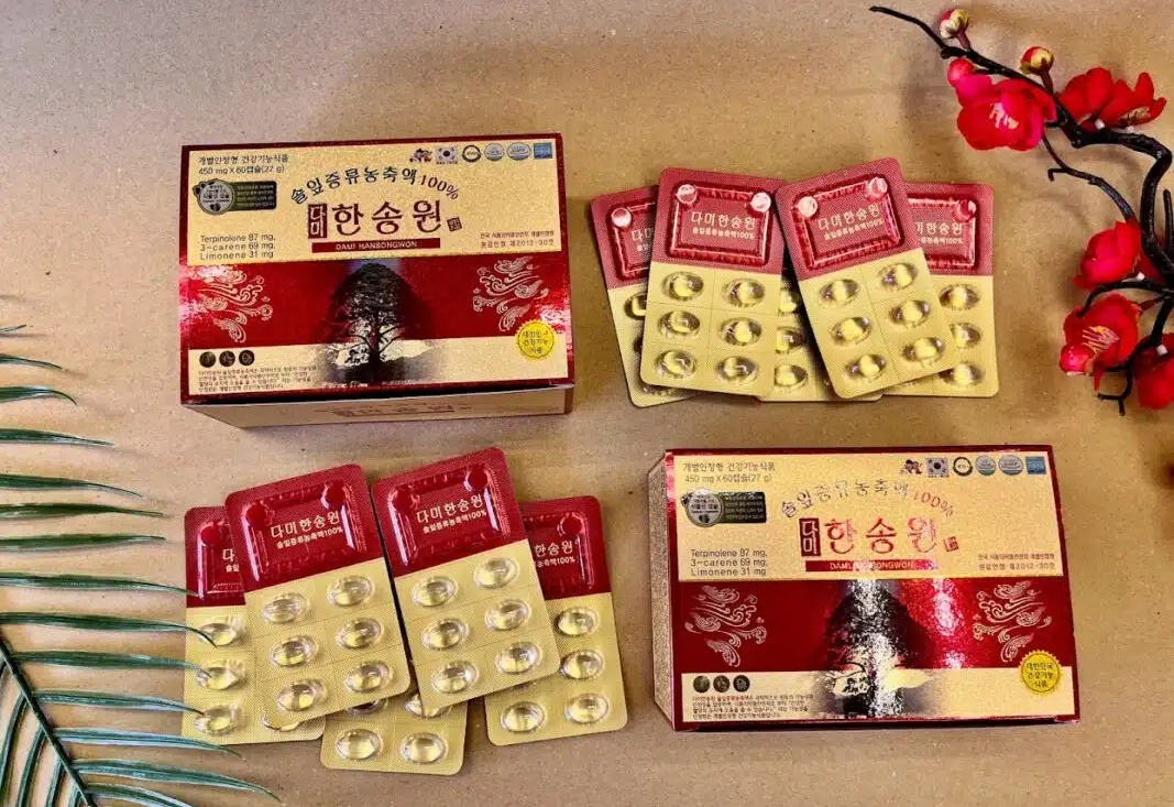 Tinh chất lá thông cô đặc (Terpinolene 18~26%, 3-Carene 12.5%~16.5%, Limonene 5~10%) chiếm 100%, gelatin, nước tinh khiết, glycerin, D-Sorbitol Solution.